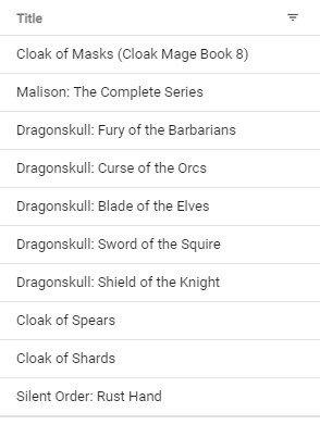 Since SILENT ORDER: WRECK HAND should come out in a few days, it was good to see RUST HAND still in the top ten. CLOAK OF MASKS took #1 because it was the newest one, and MALISON: THE COMPLETE SERIES had a very successful Bookbub on 11/7.