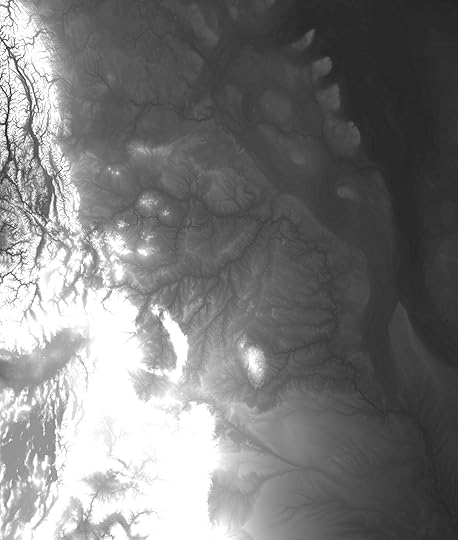 Some days, when you're working with spatial analytical software, looking for a way to shoehorn techniques used to study bighorn sheep into studying the historic gravities of power, you forget that you're dealing with some of the most beautiful imagery to have graced the retina. There's something about radar topography and electron microscopy that reveal shapes and patterns both foreign and familiar. Here's Canada and the northern United States, round about the Rockies.