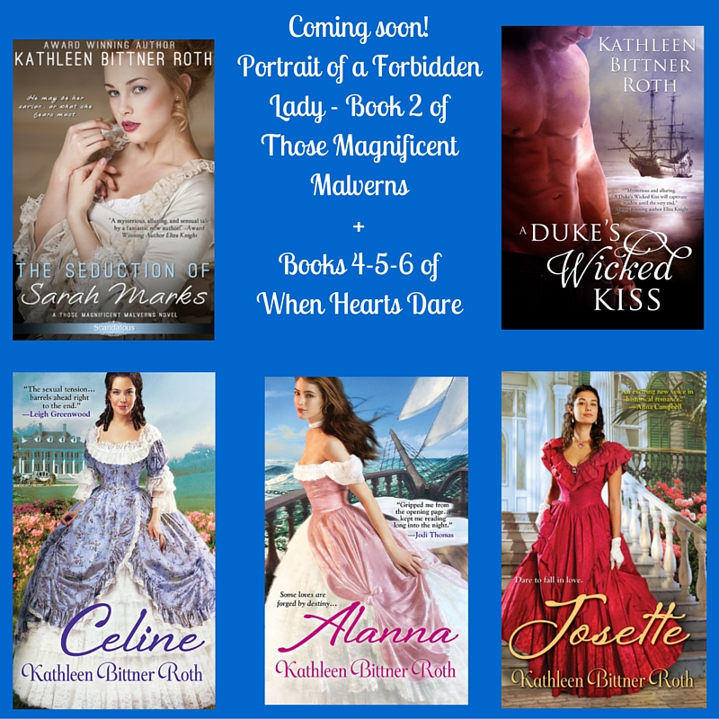 Kathleen Bittner Roth thrives on creating passionate stories featuring characters who are forced to draw on their strength of spirit to overcome adversity and find unending love. Her own fairy tale wedding in a Scottish castle led her to her current residence in Budapest, Hungary, considered one of Europe’s most romantic cities. However, she still keeps one boot firmly in Texas and the other in her home state of Minnesota. A member of Romance Writers of America®, she was a finalist in the prestigious Golden Heart® contest. Find Kathleen on Facebook, Goodreads, Twitter, Pinterest and www.kathleenbittnerroth.com.THE SEDUCTION OF SARAH MARKS is book one in Those Magnificent Malvern series and is currently on sale for .99: When a proper Victorian miss awakens next to a handsome stranger, she must rely on the man's benevolence as she struggles to regain her memory and hold onto her heart. BUY LINKPORTRAIT OF A FORBIDDEN LADY is book two in Those Magnificent Malvern series and is due to release in May 2016 (cover not yet available): A young widow returns to her childhood home after a forced absence and faces her first and only love, but despite their powerful attraction, danger compels her to remain his forbidden lady.