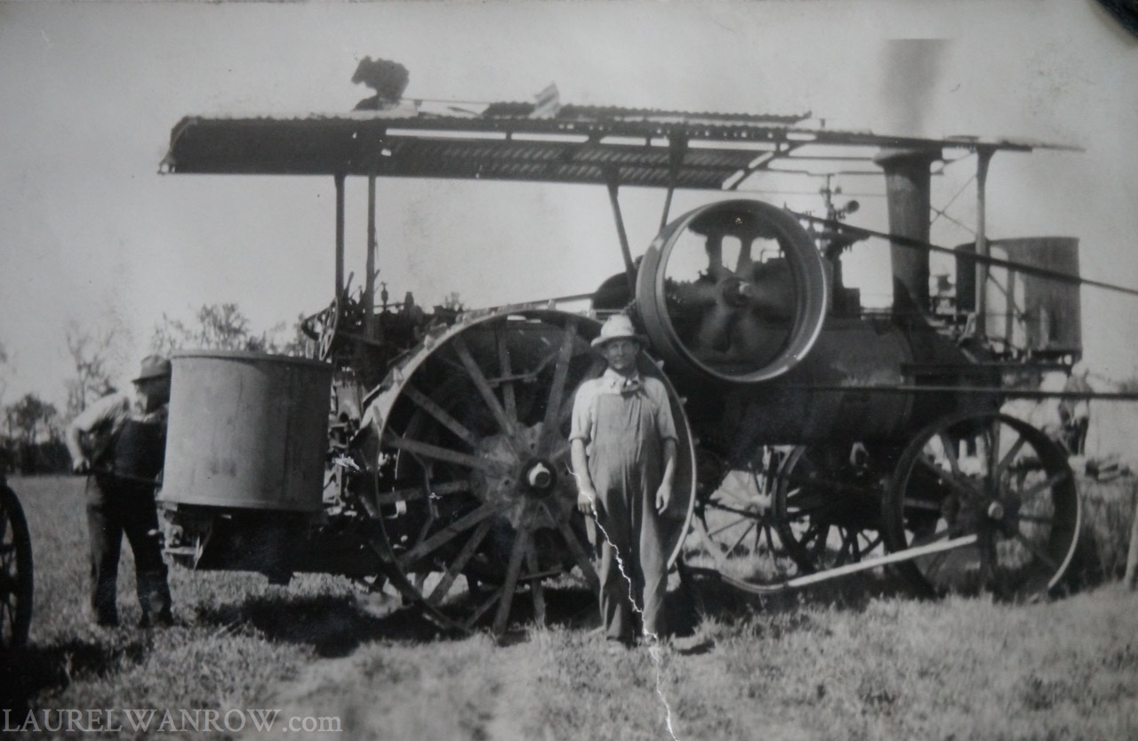 I started to correct my aunt on this math, but she reminded me they had to stop to stoke the fire, add wood, and add water to the steam engine, which meant unhooking and bringing the water tank around each time. He’d pretty much use up that tank of water. My grandmother knew the route, so would catch them at noon, taking Herb his lunch along the road. He ate as he drove—fried chicken, pickles, bread and pie or cake.