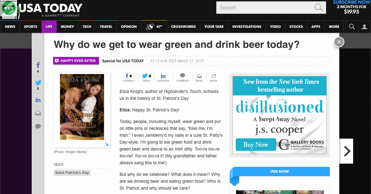 Top 'o the morning to ye! And a very happy St. Patrick's Day!Today, I've been featured on USA Today's HEA Blog where I'm talking a bit about the history behind St. Patrick's Day.