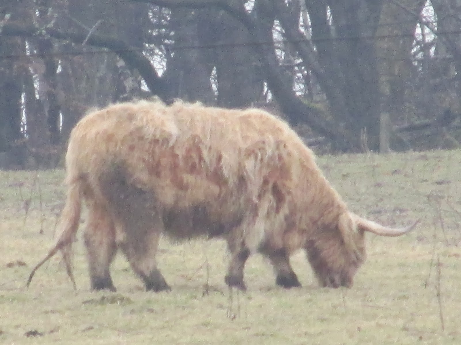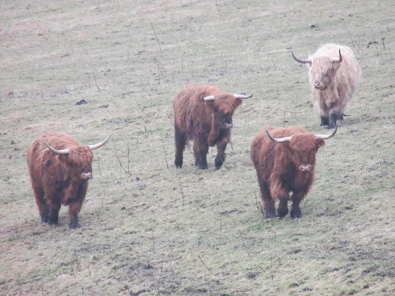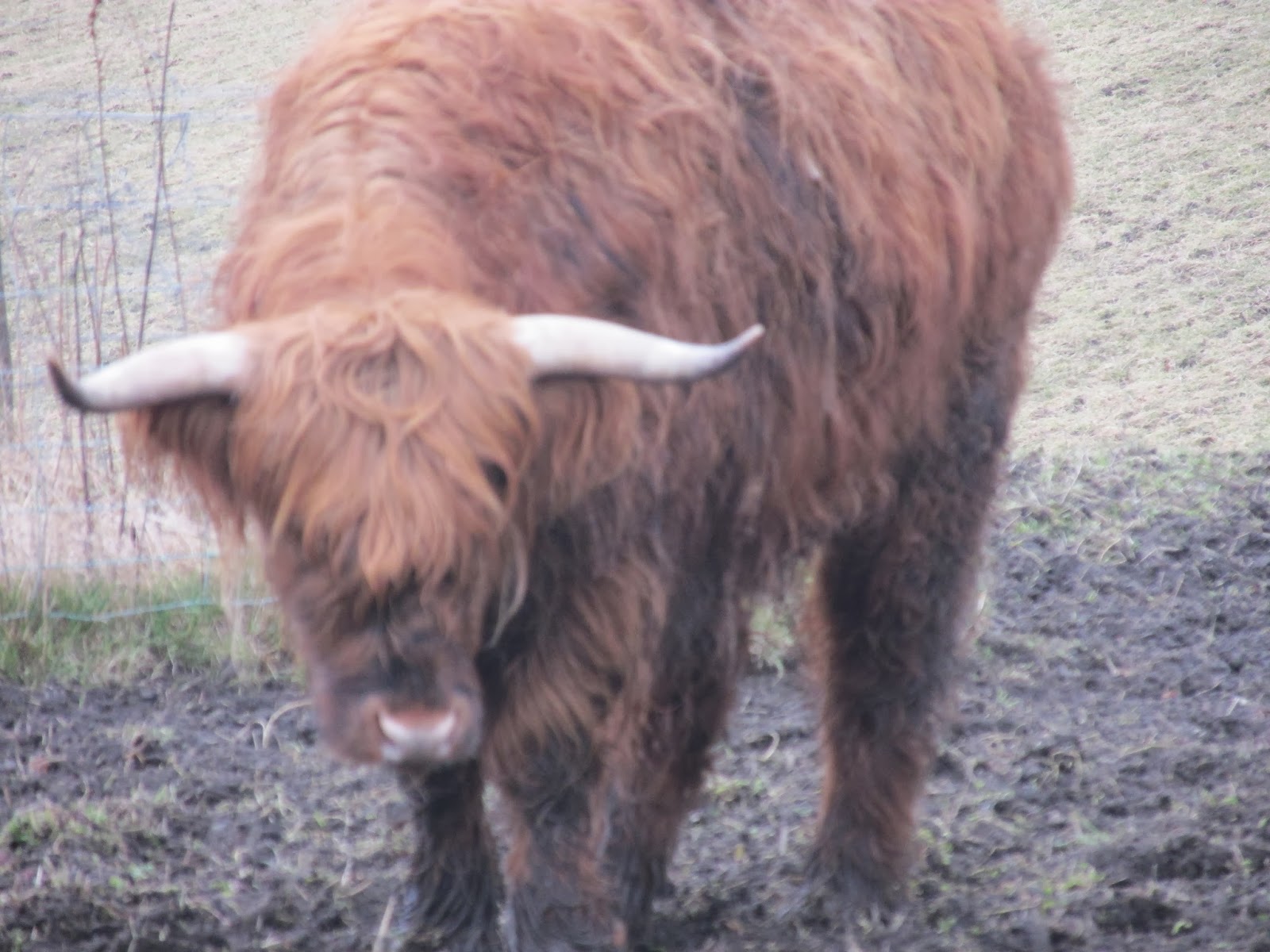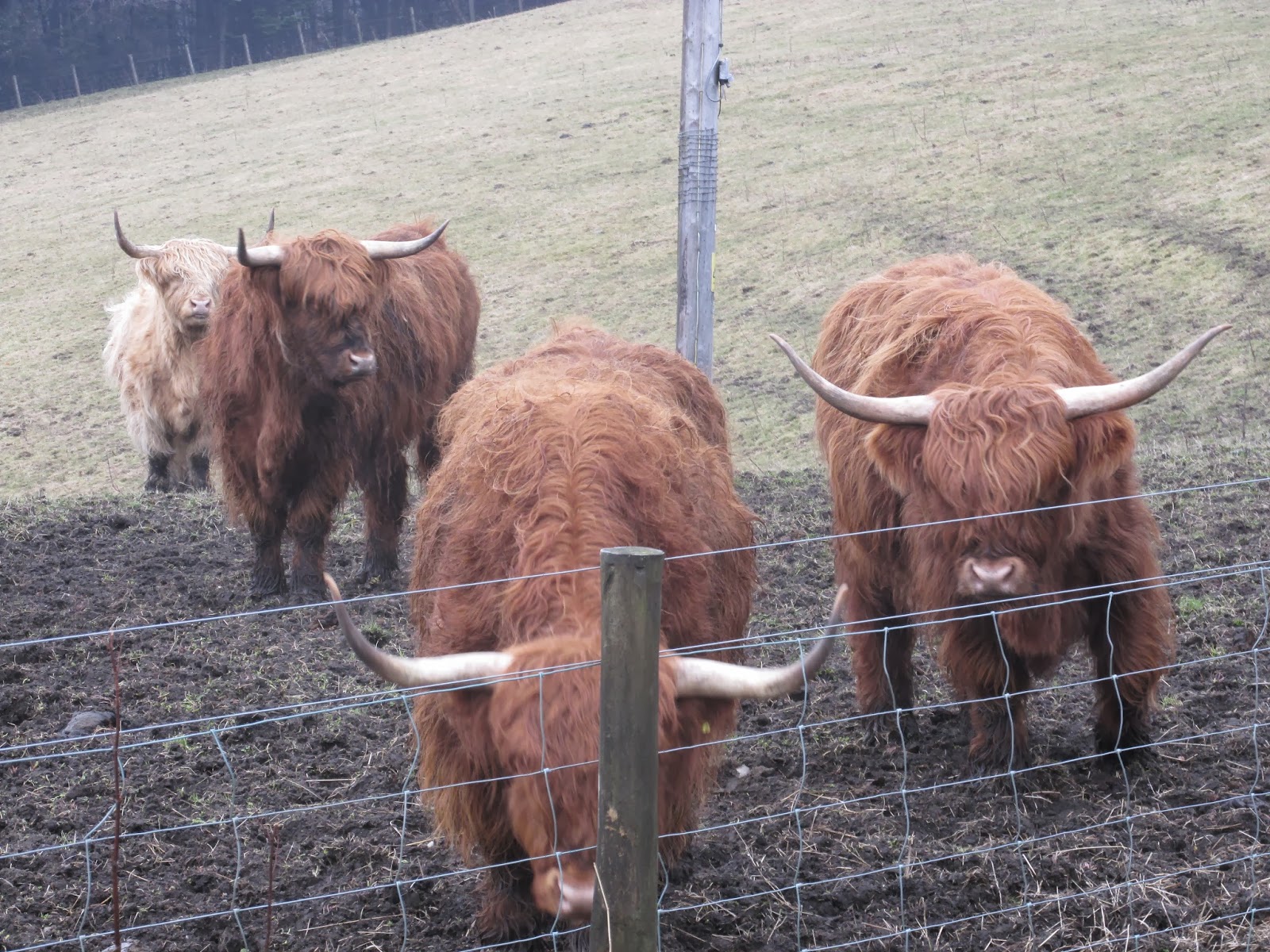 Funny story... My friend and I stopped at a castle ruins. We parked near a fence and when we got out of the car, we heard these great snorting and scary mooing sounds. Glancing up, we saw four Highland cows barreling toward us, horns down. I was certain they'd come tearing through the flimsy fence to gore us. So I ran. Screaming. Hilarious really... My friend called me back over. The cows had stopped at the fence and looked up at us docilely. I'm guessing they'd just been excited, and maybe were looking for some treats. My dad has a cattle farm (beautiful blacks and browns) and they run over to the fence for us to give them treats all the time.