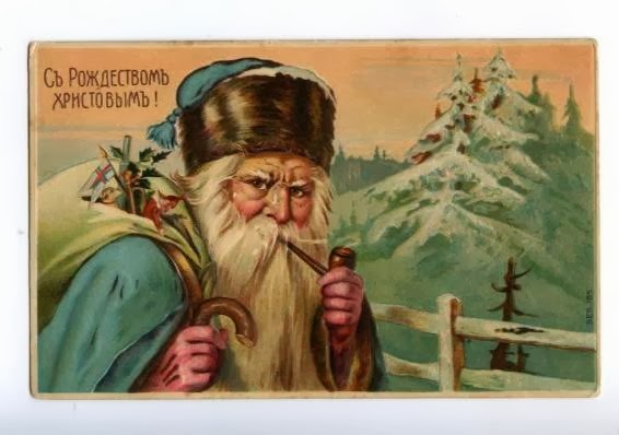 Happy Christmas (pre-1917 Russian postcard)Religious observances surrounding Christmas also flourished in Imperial Russia. Though the foods and customs surrounding the observance of Christmas differed from village to village and family to family, certain aspects remained the same. Christmas Eve was the last day of the six week Christmas fast, and for the devout, ancient custom dictated that no one eat until the first star shone in the sky. Hay was spread on the table and covered with a white cloth in imitation of the manger. Dinner began with a prayer for the New Year and a special porridge called kutya. The head of the household would throw a spoonful outside to encourage Grandfather Frost to spare the crops, then a spoonful was thrown up on the ceiling. The grains that stuck foretold the number of bees there would be in summer to ensure a plentiful honey harvest. Lastly, upon rising from the table, everyone left some kutya in their bowls for their departed relatives.