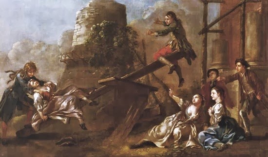 I like finding small details that characters can interact with, something of the times that would be considered like how we see Coca Cola cans in people's hands today. One of the scenes in my book is set in Vauxhall Gardens, and when I was researching the layout of the gardens, I read about the paintings that decorated the supper boxes. I though, here is a perfect detail that my characters can interact with. Something that was normal in the time period, taken for granted, an every day item to anyone who visited the Gardens regularly. In the scene, my heroine is dealing with a friend/suitor and I thought showing their opinions about the paintings was a great way to illustrate aspects of their relationship. The painting in question was See Saw by Frances Hayman (below).
