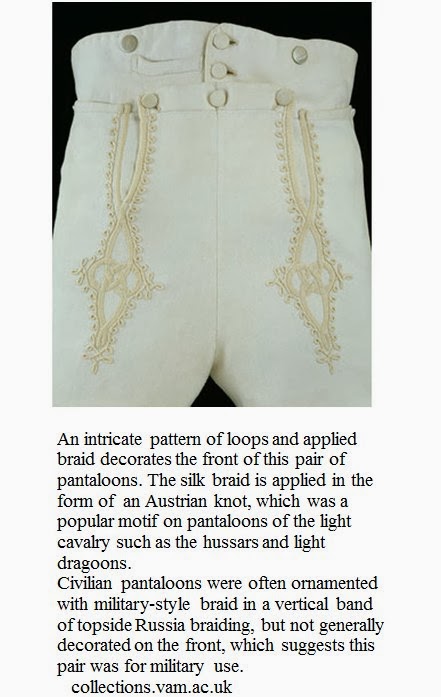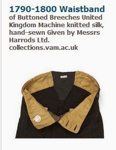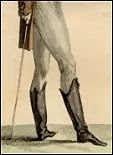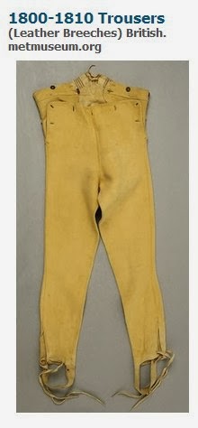 Riding breeches, or buckskin breeches, were still worn for comfort. These were tighter fitting and had either, or both, button and ties for fastening at the knees. They became longer, to the tops of long boots, while for daywear, pantaloons and trousers replaced breeches.