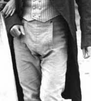 Evening dress pantaloons and trousers were generally of white or black kerseymere or cashmere. Peg-Top Trousers, named for a peg-top cone-shaped spinning top, were wide and pleated at the top and had very narrow ankles.