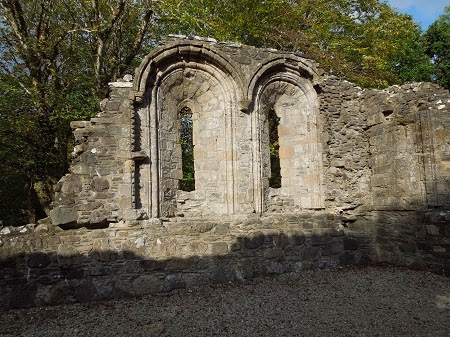 The chapelThe chapel ruin sits in a woodland behind the castle. It was a family chapel, serving the lord's household, instead of the parish. The remains show that it was once an extraordinary building which shows the wealth and sophistication of its builder, Duncan MacDougall. No other chapel of this date in mainland Scotland can match it for quality. It is 65 feet long and was at one time divided by a timber screen into a nave and chancel. The architecture was inspired by Irish churches but some features are similar to other churches in the area, such as Iona. It likely had elaborate arched doorways. The photo shows one of the paired lancet windows in the chancel. By 1740 the chapel was in ruins.