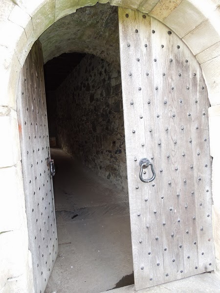 From inside the castleThe castle sits on high rocky promontory, and the walls rise more than 6 more meters. The original tops of the walls are gone, so it's unknown if they were battlemented or covered in a timber structure. Excavations show that the castle was originally surrounded by an eight meter wide ditch. The only openings in the landward side of the curtain were narrow arrow slits. After 1500 these were blocked up and even smaller gun loops inserted.