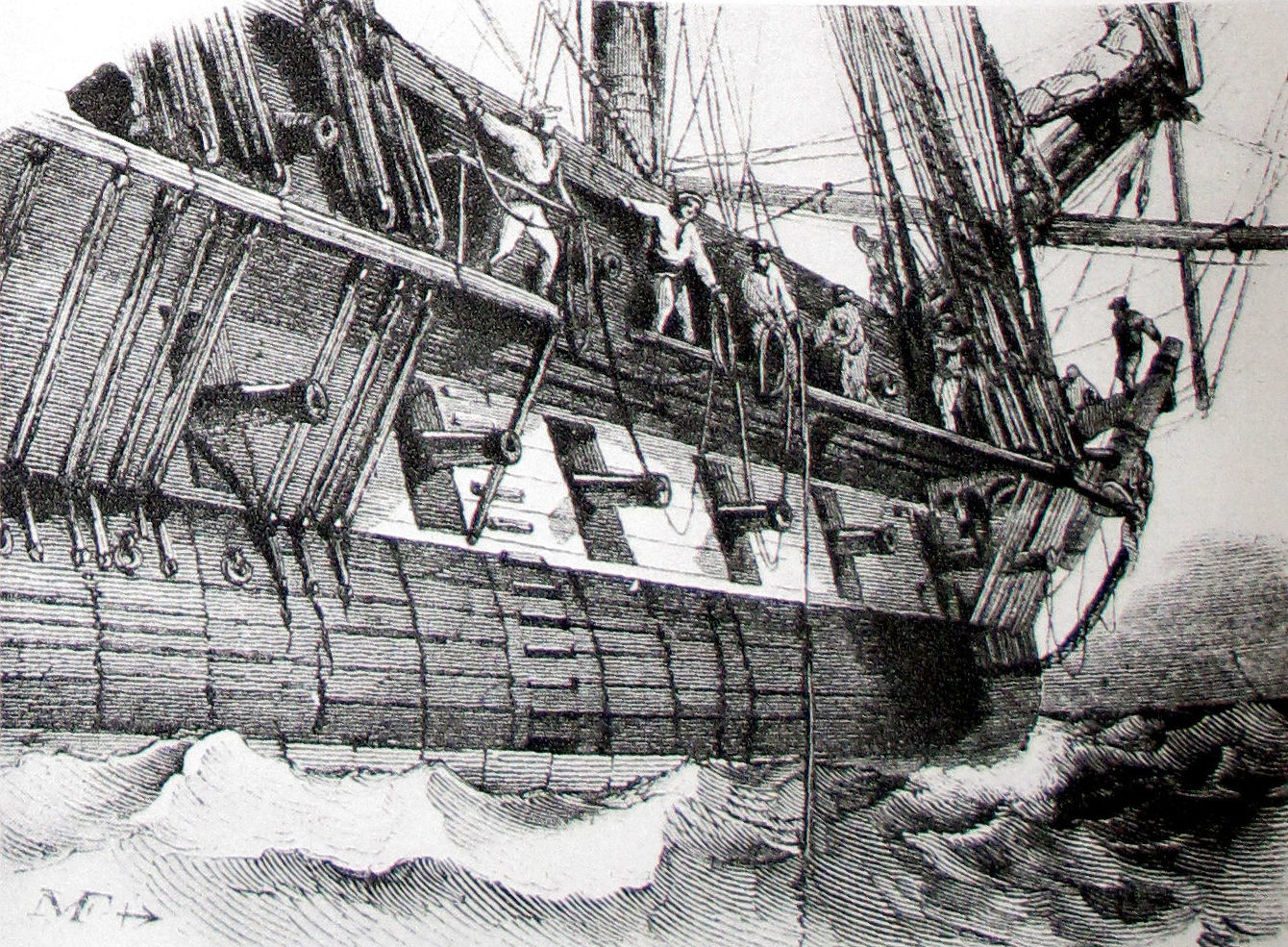 Lead line - a long rope with a lead weight at the end and knotted at various lengths used to measure depth. The lead weight also had a hollowed bottom filled with tallow or animal fat. This sticky substance would bring up the make-up of the seabed (sandy, rocky, clay, shells, pebbles) providing important information on anchoring or piloting a ship.