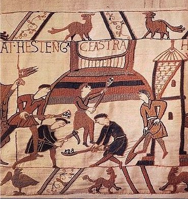 Building a motte from the Bayeux TapestryThe Bayeux Tapestry (actually an embroidery) shows the construction of a motte on flat ground. The image shows men digging out a ditch and heaping the earth in the centre to make an artificial mound. The top of the mound was flattened, and a wooden tower or donjon was built on top. It could be used as a lookout tower or the last refuge in an overwhelming attack. The bailey was an enclosure which contained the residential buildings: a great hall, a separate kitchen building, chapel, stables and barns, a chamber block and at least one well--very important that last. Both motte and bailey were surrounded by a palisade of wooden posts, connected by a wooden bridge or gangway. Seven hundred motte-and-bailey castles show that most of Britain was conquered; they are found all over England and are particularly dense in Wales as resistance to the Norman invasion was fierce. In Scotland, the Normanised David I gave land to Anglo-Normans in the Lowlands and the north-east of Scotland.