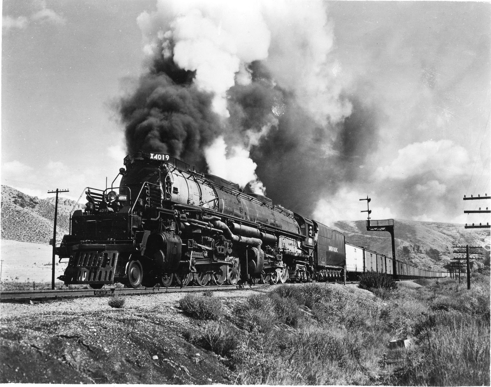 Photo Courtesy Sweetwater County HistoricalMuseum While other U.P. divisions were rapidlyconverting to diesel engines, the Wyoming Division continued to run the hugeblack steam engines called Big Boys in order to best utilize the company'scoal. Men hitched rides to work onMonday on milk trains, local trains that hauled the mail and were willing tostop anywhere free of cost to company employees.