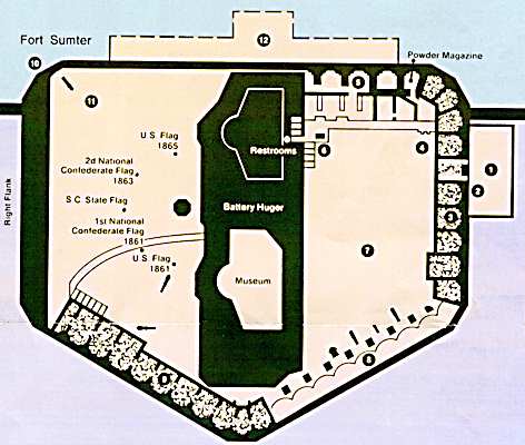 Fort Sumter National MonumentThe boat rideout into the harbor was pleasant. When we walked along the wharf and stared atwhat was left of the walls, we were silenced by what we saw. Even though littleis left of the original structure, our visit allowed us to walk through theSally Port and into the inner parade ground. Dozens of cannons were on displaysurrounded by battered walls, broken staircases, and decrepit barracks. The sectioncalled Battery Huger, added years later, contains another museum and a tatteredflag that once flew above the fort. A grassy overlook allows visitors to looktoward the sea and imagine the soldiers as they waited for supply ships that neverarrived. The fort's five-foot-thick walls still stand, but only the firstfloor. Parts of the second level are in ruin, but the entire third level wasblown away as the war progressed and after the Confederates took control of thegrounds. There is little left of the enlisted men's barracks, or the officer's quarters.Though the fort was 90% complete by the time the Federal soldiers were firedupon and held ports for 135 guns and could house a garrison of 650 men, only aboutnine or ten casement guns returned fire. Only 85 men stood against thousandsduring April 12 through April 14th, the beginning of what becamefour years of Civil War.