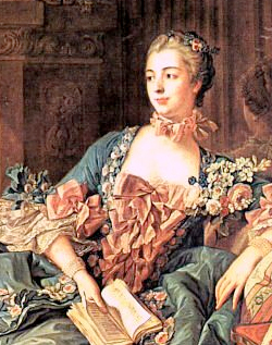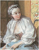 Detail Boucher's painting of Mme de Pompadour and the inspiration for Antonia's jumps fastened with pink ribbons. In 1770, Jacques Bonnaud wrote a treatise on the wearing of whalebone corsets arguing that not only was a woman submitting to a form of torture but that such an undergarment went against the laws of nature because stays prevented a woman from breast feeding her newborn infant. So it is not surprising that pregnant women wore jumps that not only had front lacings but side lacings to allow for the expanding bust and waistline of the mother-to-be and allowed nursing mothers to breast feed, something that could not be accommodated if wearing stays.