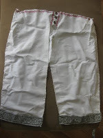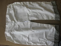 Shows the "crotchless" section of the drawers.Pantaloons and pantalettes often had pretty lace and embroidery along the bottoms—much like on the sample drawers I made, and were meant to be seen when a woman lifted her skirts, to say, walk over a puddle or up some stairs. Pantalettes, were not only crotchless, they were in fact two separate pieces that covered the legs and tied around the waist. Pantaloons, were more like an extended version of the drawers—coming down to the ankles.