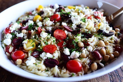 Place the orzo and all the other ingredients in a large mixing bowl and pour the dressing over the top. Stir to combine, taste and adjust seasonings, and refrigerate at least an hour before serving. Top with more feta and parsley and serve as a main dish salad or with grilled chicken, fish, or burgers!