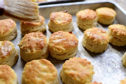 Roll out dough to 1/3 to 1/2 inch thick and use a biscuit cutter to cut medium to small circles. Place on a baking sheet 1/2 inch apart and bake for approximately 10 minutes, or until golden brown on top. Remove from oven and immediately brush on melted butter. To die for!