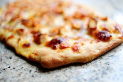 I made pizza for the show a couple of days ago, and this tomato-basil version with four different cheeses made my skirt fly up, my soul sing, and my spirit soar. It was tremendously delicious, and while I wasn’t able to take step-by-step photos, I was able piece together what I did using process shots from a couple of different archived recipes here: Pizza Dough and Bruschetta.