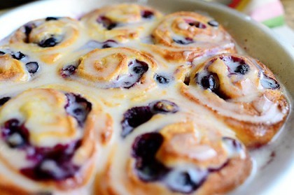 When they’ve puffed up a bit, throw ‘em into a 375 degree oven for about 15 minutes or so, until they’re nice and golden brown. Make sure they’re definitely golden brown on top, as that will ensure that the rolls are done underneath (some of the blueberry juice will collect at the bottom, so they need a little extra baking.