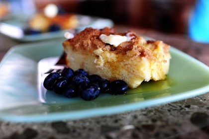 On this morning’s Food Network episode, I make (among other things) this beautiful, simple, glorious, easy, delectable, scrumptious, heavenly baked French toast, which I served with syrup and blueberries to my daughter and her four friends. The girls absolutely loved it—between the six of us, we nearly polished off the whole pan—and it’s always one of my favorite things to make for breakfast, particularly when I have visitors. (I think I’ve made it for four or five groups that have come to stay at the Lodge this summer.) The great thing about baked French toast is that you can make it on the spot and bake it right away…OR assemble it the night before and let it sit and get even more luscious in the fridge overnight. You can leave it plain like this, or you can mix blueberries or other fruit in with all the bread.