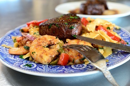 4 whole 6-ounce Beef Filet Steaks 1 1/2 Inches Thick (or Any Small/petite Steak) Cajun Seasoning2 Tablespoons Butter3 Tablespoons Olive Oil1 pound Jumbo Shrimp, Deveined & Shells Removed1 whole Small Red Onion, Halved And Sliced1 whole Green Bell Pepper, Seeded, Halved, And Sliced1 whole Red Bell Pepper, Seeded, Halved, And Sliced3 cloves Garlic, Minced1/2 cup White Wine1-1/2 cup Low-sodium Chicken Broth (more To Taste)3/4 cups Heavy Cream1/2 cup Parmesan Cheese, Grated2 whole Tomatoes, Diced Minced Parsley, To Taste1 pound Fettuccine, Rigatoni, Or Other Noodle Preparation Instructions