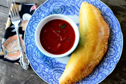 I serve my calzone with marinara sauce for dipping. It’s more of a fun experience that way and everyone can control the amount of sauce he prefers. But you can also smother the calzone with marinara if you like things messy.