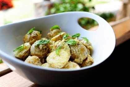 Cover and refrigerate the potato salad for a few hours. To serve, sprinkle lots of small basil leaves over the top. Yum!