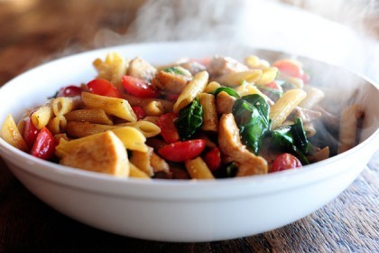 Turn off the heat. Add spinach, tomatoes, chicken, and cooked pasta to the skillet. Toss to combine; the spinach will wilt as you toss everything. Add plenty of Parmesan shavings and toss to combine.