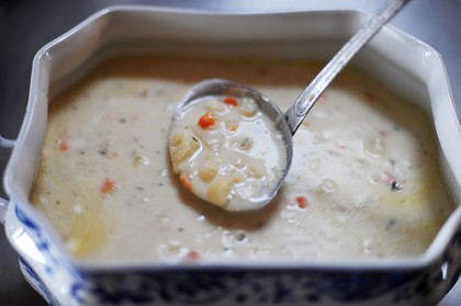 And now for the fun part: Pour the white sauce into the simmering soup mixture.