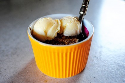 The lovely thing about fruit crisps is that you can use the basic recipe with any fruit you want: peaches, pears, apples, berries, cherries. And while I'd normally make a crisp in one big baking dish, the ramekins can be really nice because everyone's dessert is self-contained and you're not having to scoop out big, messy portions from a big ol' dish. Not that there's anything wrong with big, messy portions from a big ol' dish. That pretty much describes everything I cook. But still.