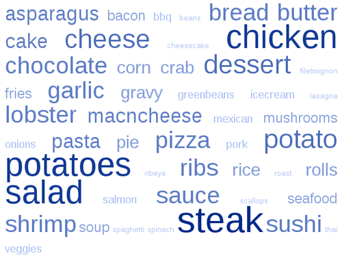 UPDATE: First up, Statistician Don compiled some great visuals of your answers to the "What would you have for dinner tonight if you could have anything?" question. Here are the results in his words!