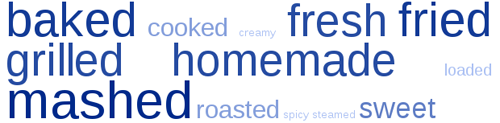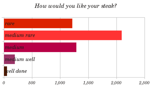 "This contest was fun to do, but man am I hungry now! Unsurprisingly, steak was the big winner, though chicken was hot on its heels. For your viewing pleasure, I have not one, but two tag clouds! The first has the top 50 most-listed items for dinner. The second is how you'd like it made (basically a bunch of the most popular descriptors). Finally, (What? Three plots!) shows the breakdown of how respondents take their steak. Not everyone who listed steak described how they like it cooked, so this just shows the counts for those who were specific."
