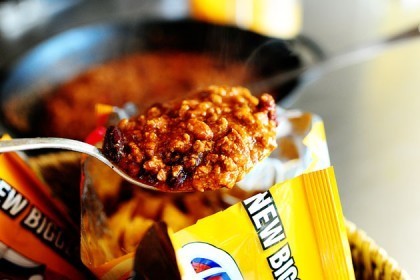 Now just stir it together and simmer it for another 10 to 15 minutes…and that's it! Be sure to taste the chili and make sure it has enough salt…but keep in mind that the Fritos are muy, muy salty. So you might want to tread lightly, baby.