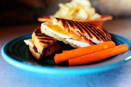 For all its simplicity, this panini really turned into something yummy! And if you don't have a panini maker, don't fret! Just grill the sandwich in the skillet with a second (heavy) skillet on top of it to press it together. It'll make you feel inventive and nifty.