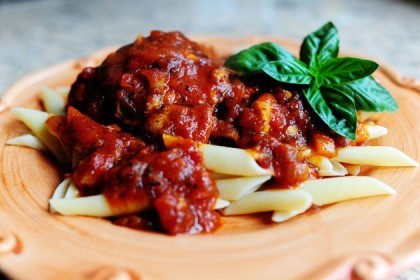 Then just throw some pasta onto each plate and serve up a chicken thigh (or two) with plenty of sauce.