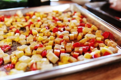 Throw them into the same (very hot) pan and toss them around until slightly brown, about a minute or so. Remember, the point here is to get a nice color started on the outside of the vegetables—not to cook them.