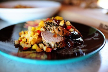 If needed, add a bit more olive oil to the very hot pan. Place the meat in the pan and sear it for about a minute on all sides until it is nice and brown all over. Remove the roast to a plate.