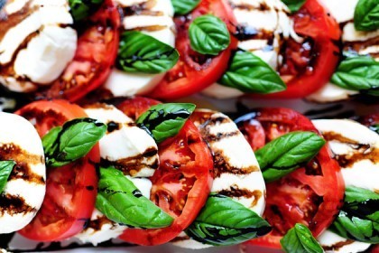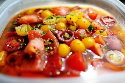 Combine all ingredients except tomatoes in a large glass bowl. Whisk to combine, then add tomatoes. (You can up the quantity of tomatoes if need be.) Use regular red tomatoes, or a mixture of red, yellow, heirloom, etc. Use different sizes of tomatoes, too--pretty!