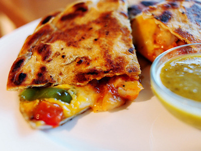 In a separate skillet, heat butter. Place a tortilla in the skillet, then layer on ingredients: cheese, vegetables, and shrimp. Top with a little more cheese and a second tortilla. Cook on both sides, adding butter before flipping to the other side so the tortilla isn't overly dry.