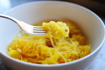 Back to the squash, just grab a fork and begin picking. You'll see the magic happen! All of a sudden, this stuff that looks like solid squash breaks apart into beautiful, thin pieces of…spaghetti!
