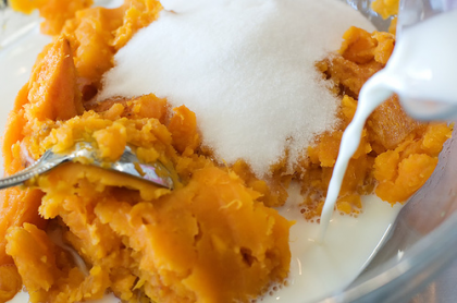 Wash 4 medium sweet potatoes and bake them in a 375-degree oven until fork tender, about 30-35 minutes. When they are finished cooking slice them open and scrape out the flesh into a large bowl.