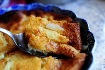 Bake for 45 minutes or until poufy and no longer overly jiggly. Remove from oven and allow to cool for at least 10 minutes. Serve with freshly whipped cream flavored with sugar and cinnamon.