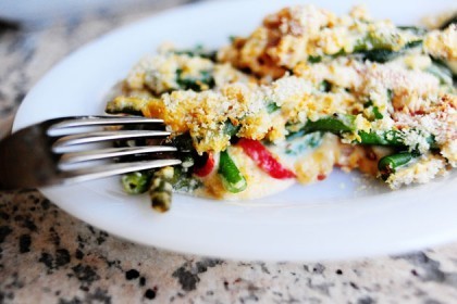 Today I'm sharing a from-scratch green bean casserole that's a cinch to make and a nice departure from the cream-of-mushroom standby we all know and love. The wonderful thing about it, besides the fact that it contains bacon, is that it begins with a plain white sauce, which can be adapted in any number of ways. Use a combination of different cheeses, add a little mustard, some mushrooms–whatever floats your boat. And while I opted for a topping of panko breadcrumbs, you can substitute the yummy french fried onions (or crushed potato chips; you heard me) if that's more to your liking.