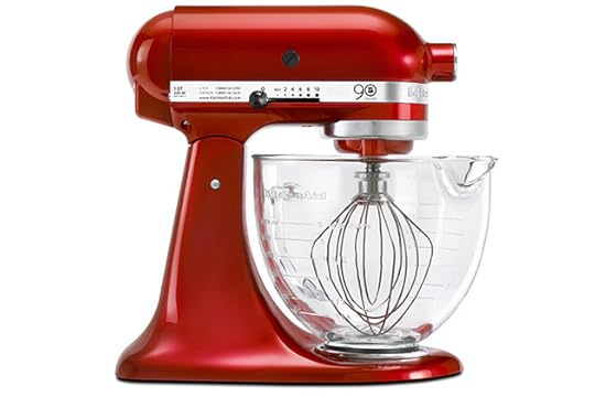 I'm giving away three (3) of these lovely, shiny candy apple red Anniversary-edition Kitchen Aid mixers.