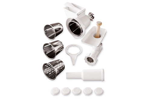 Also included is this handy dandy attachment set, which will allow you to grate, chop, grind, extrude, and solve many of the world's problems.
