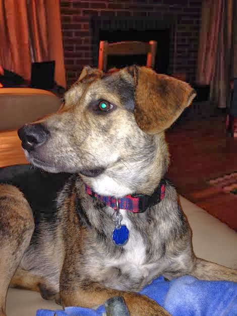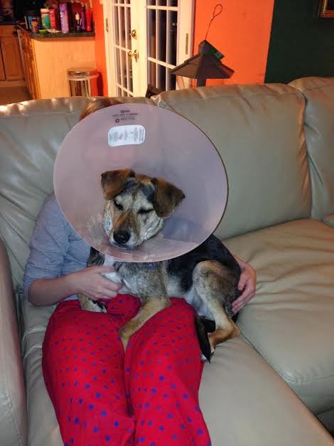 Franklin was neutered and micro-chipped eleven days ago. The vet sent him home the same day into the custody of my daughter and I, only because we are EMTs. She normally keeps the dogs overnight in case of scrotal hemorrhage. I'm happy to report no issues. The hard plastic halo (above) was extremely difficult for the little guy to navigate with. No peripheral vision, it wouldn't fit into his hut (our word for the crate he sleeps in at night) and he couldn't eat or drink or sniff well. My husband found him a pliable cloth halo at Petco which was much more puppy friendly. He is now healed well enough for full activity, whoo hoo!