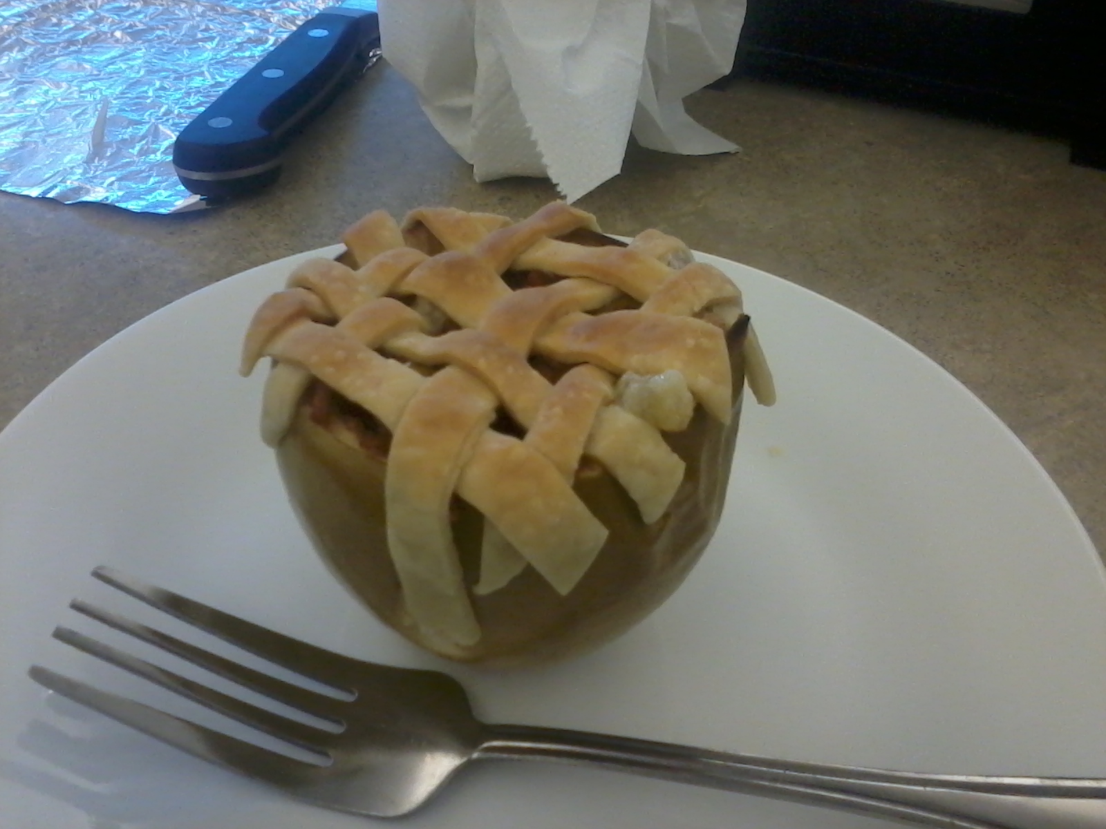 Cover the top of the apple in a lattice pattern with pie crust strips.