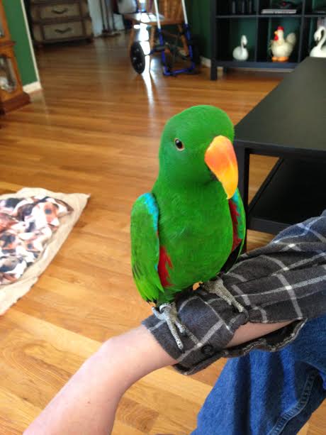 My son, Andy, has always loved birds. I remember he used to be an eagle, "flying" home from kindergarten down the sidewalk. His first pet bird was a beautiful green budgigar named Bud. He was very sweet, he used to preen my eyebrows. It tickled. We didn't understand that you can't give birds a steady diet of seeds. It's toxic to their organs. Bud passed away after only a few years. Of course, my firefighter husband was on a 24 hour shift at the time so I had to take care of the arrangements.Andy studied birds, reading every related book in the elementary school library. He settled on a Solomon Island Eclectus parrot, which is a medium sized parrot. They are unique in nature as the females are always red and the males are always green. We surprised him at Christmas with a male he named Claytor, after a railroad tycoon he admired. In addition to birds, he's had a lifelong interest in trains, courtesy of Thomas the Tank Engine and my model railroader husband.