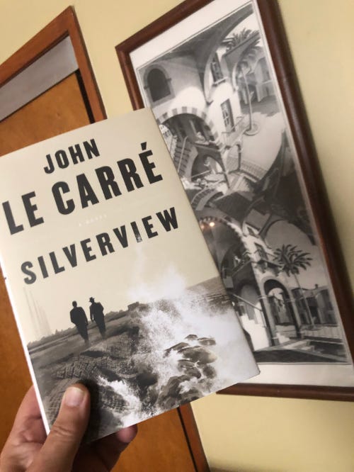 Silverview is the last novel John le Carré (David Cornwell) completed before his death in December of 2020. It was released in the US by Viking Penguin in hardcover and Kindle in October of 2021, then in paperback last July. The book includes an Afterword by the author’s son Nick Cornwell, who is a writer himself using the name Nick Harkaway.