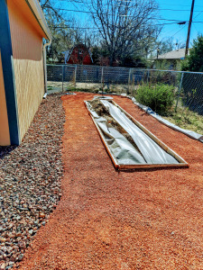 This second photo is the rear of the yard where the old garage used to be. The squared off space in the center of the red pathway will eventually be a raised garden.