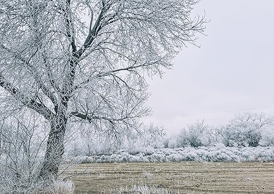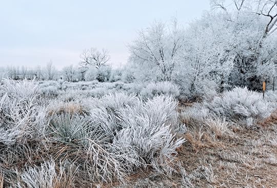 The sublime part of today (and the past couple of days) was the frozen fog. I don’t remember if I’d ever seen frozen fog before, though perhaps I did when I was young because the scene has a familiarity about it. I certainly hadn’t seen anything like it when I lived in the desert of California or the high plains of Colorado, so I enjoyed the whiteness. The white trees and shrubs, the white sky, the white . . . everything. It looks like snow, but it isn’t — we haven’t had snow for a couple of weeks. Apparently it’s cold enough (and yes, it is cold, though not as cold as it’s going to be this weekend; they’re talking about a high of zero on Sunday) to freeze the fog in the air and the moisture on the flora.